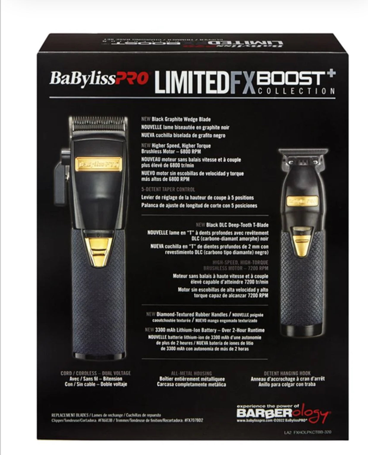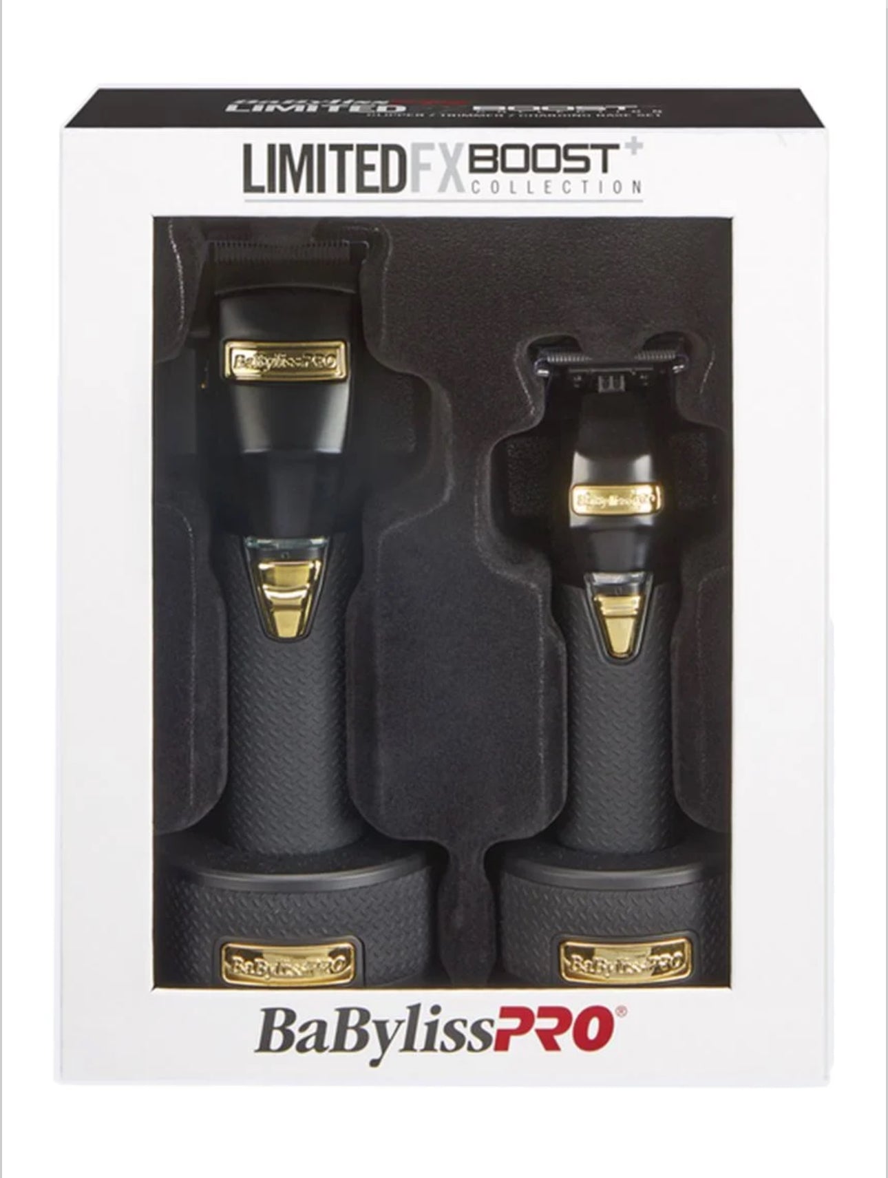Clipper, Trimmer & Charging Base Set (Black) BabylissPro LimitedFX Boost+ Collection FXHOLPKCTB-B. Clipper New Higher Speed, Higher Torque Brushless Motor- 6800, New 3300 Mah Lithium Ion Battery- Over 2 Hour Run-time. New Diamond-textured Rubber Handle. Trimmer New Higher Speed, Higher Torque Brushless Motor, 7200 Rpm, New 3300mah Lithium Ion Battery- Over 4 Hour Run-time. Standard Tooth Titanium 340 Exposed T-blade. Charging Base Solid Metal Base With Diamond-textured Rubber.